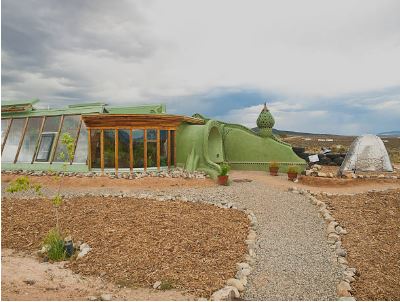Earthships are livable containers that are self-sustainable. It’s built on a hillside, facing the sun. With the earth’s constant temperature year-round, it pulls heat from the earth in winter, and cold air in summer. The roof hosts solar panels and collects rain, and the front of the house is a greenhouse using passive solar.