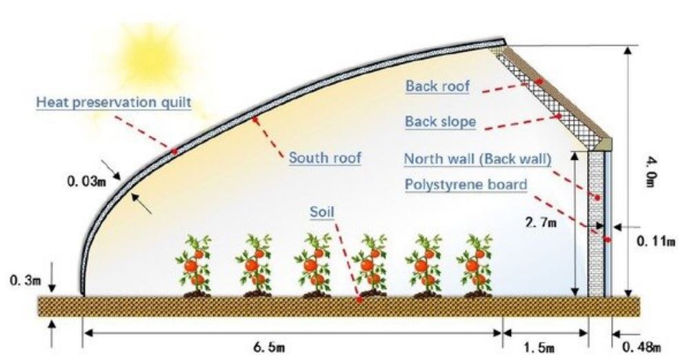 This is a type of greenhouse commonly used in northern China, where the temperature can drop to -25°C. It uses an arch shaped greenhouse to maximize sun exposure, and a backwall which also acts as a container to store heat. A blanket is lowered onto the arch of the greenhouse at night to preserve heat.